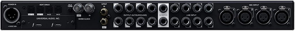 The rear of this premium device boasts some nice features, with an on/off switch, options for bus-power (USB 2.0) or a powering plug, MIDI I/O, ADAT I/O, SPDIF I/O, Word Clock I/O.